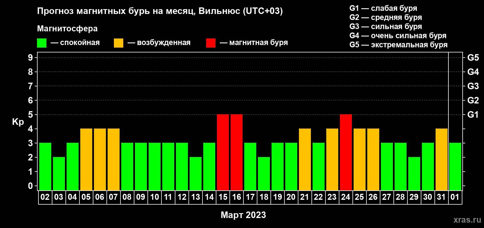 Прогноз магнитных бурь в Вильнюсе — 2 марта 2023 года