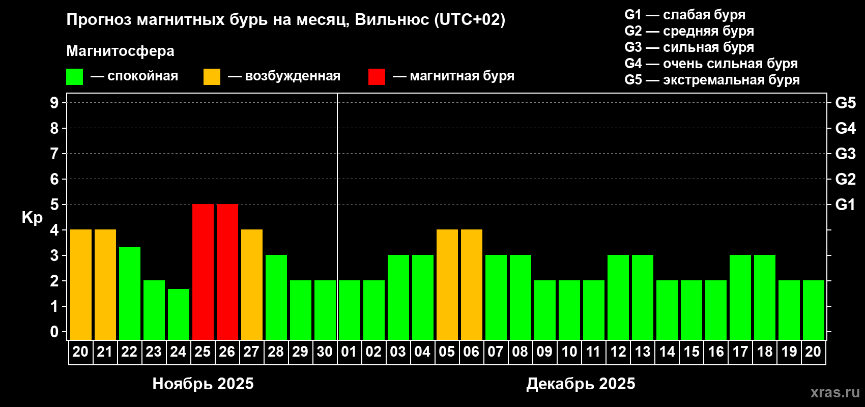 Прогноз магнитных бурь в Вильнюсе — 20 ноября 2025 года