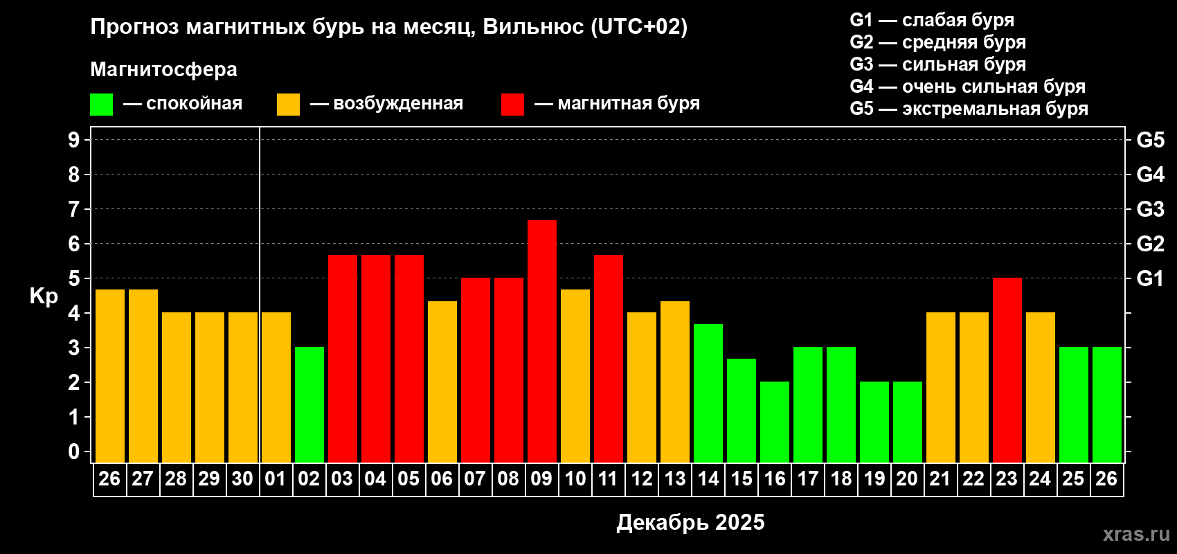 Прогноз магнитных бурь в Вильнюсе — 26 ноября 2025 года