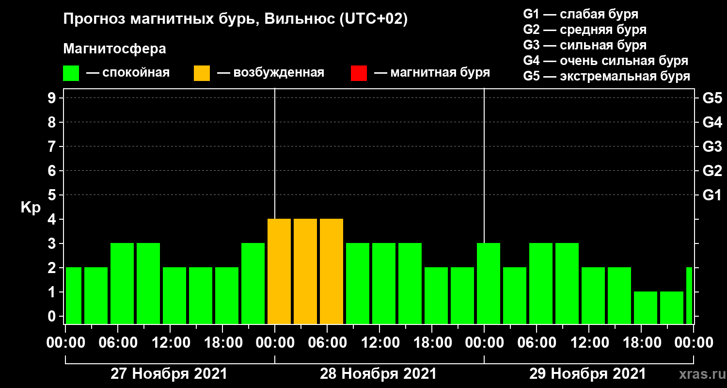 Прогноз магнитных бурь в Вильнюсе — 27 ноября 2021 года