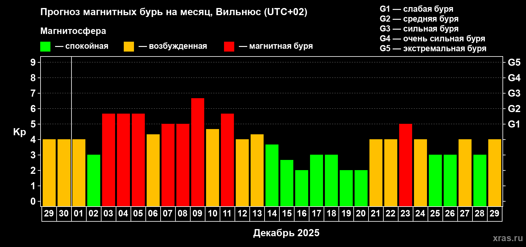 Прогноз магнитных бурь в Вильнюсе — 29 ноября 2025 года