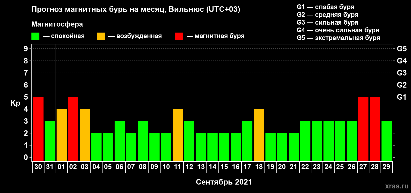 Прогноз магнитных бурь в Вильнюсе — 30 августа 2021 года