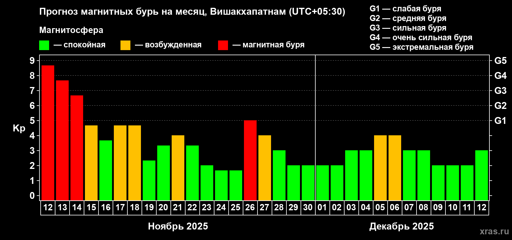 Прогноз магнитных бурь в Вишакхапатнаме на 12 ноября 2025 года