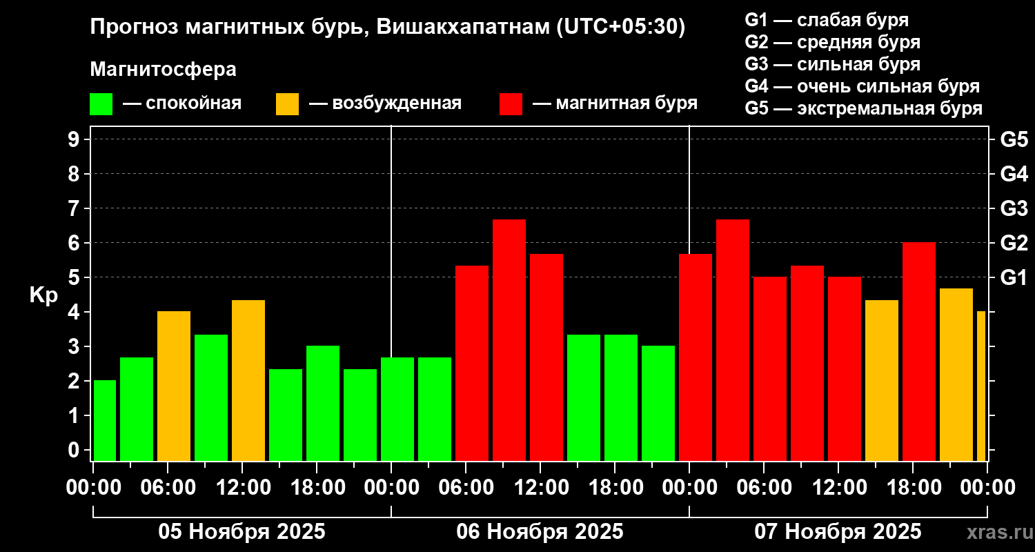 Прогноз магнитных бурь в Вишакхапатнаме — 5 ноября 2025 года