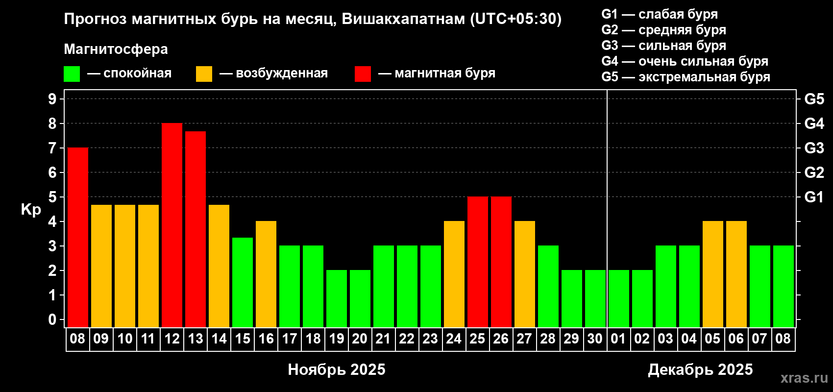 Прогноз магнитных бурь в Вишакхапатнаме — 8 ноября 2025 года