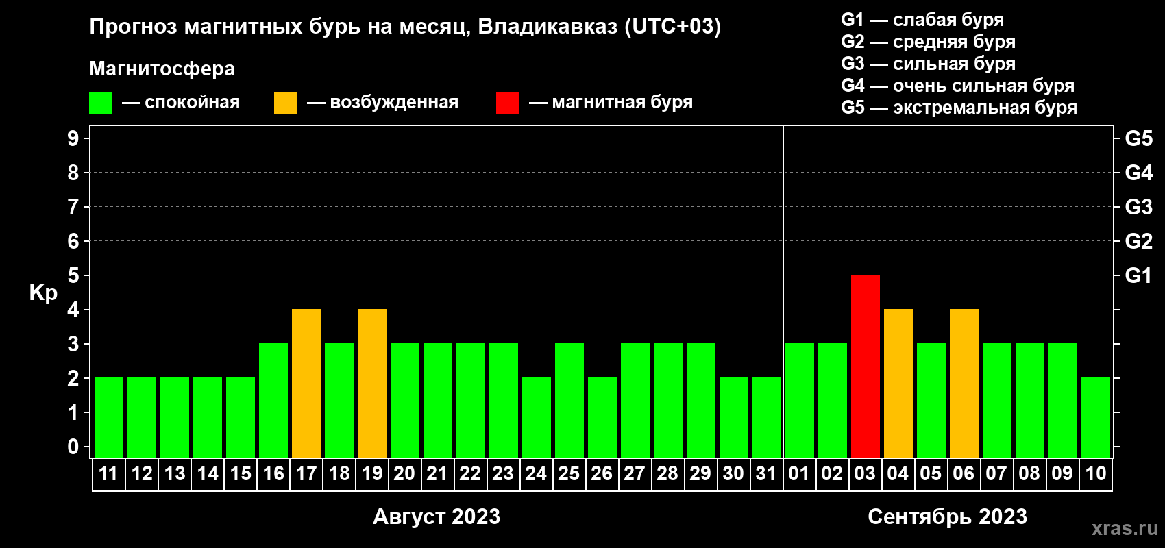 Прогноз магнитных бурь во Владикавказе — 11 августа 2023 года
