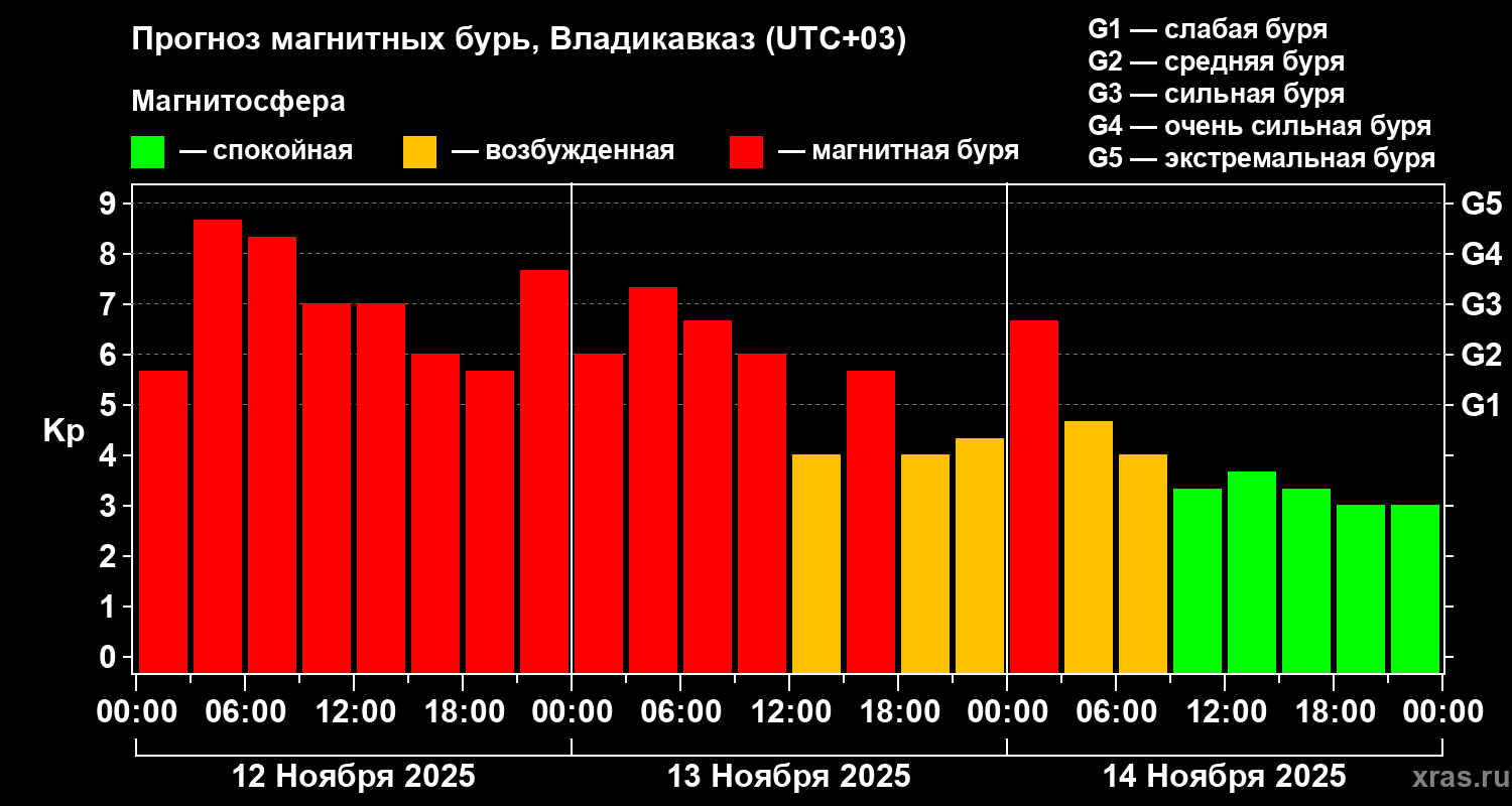 Прогноз магнитных бурь во Владикавказе — 12 ноября 2025 года