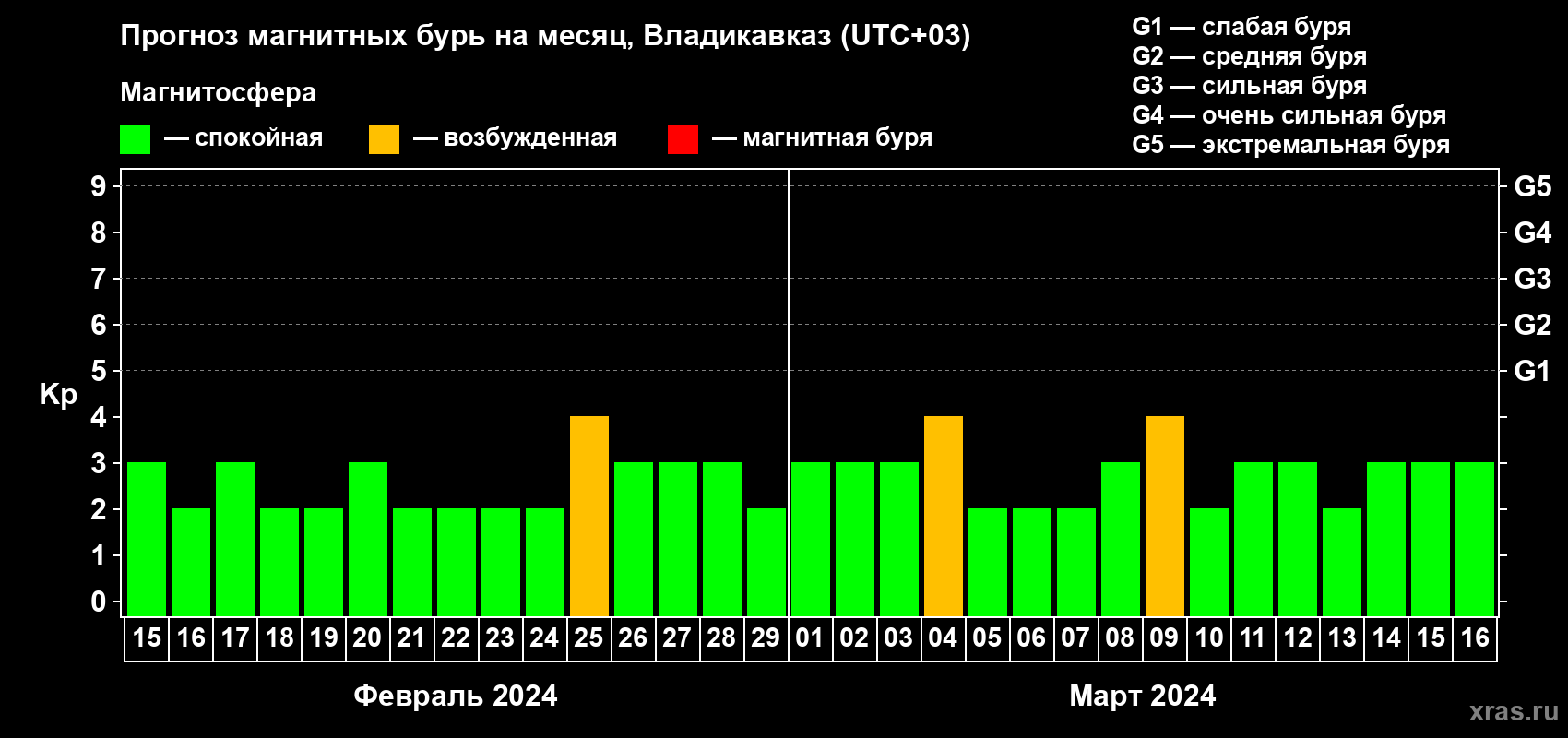 Прогноз магнитных бурь во Владикавказе — 15 февраля 2024 года