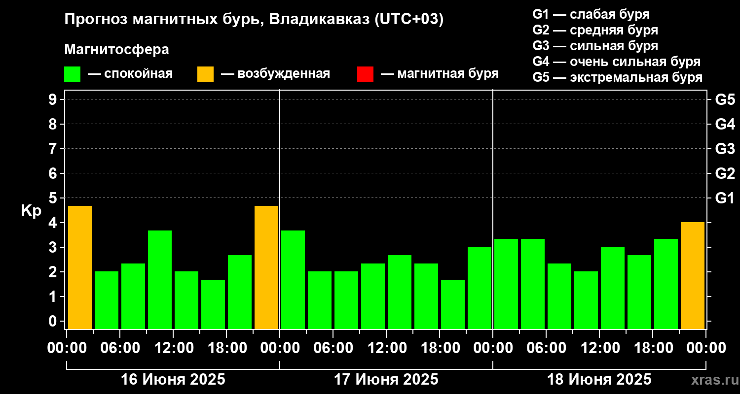 Прогноз магнитных бурь во Владикавказе — 16 июня 2025 года