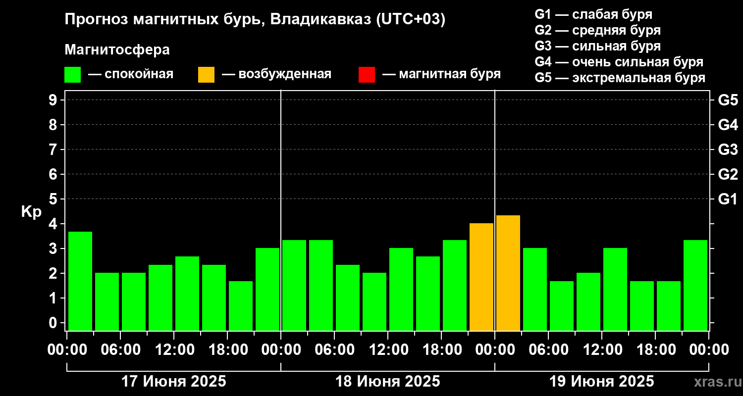 Прогноз магнитных бурь во Владикавказе — 17 июня 2025 года