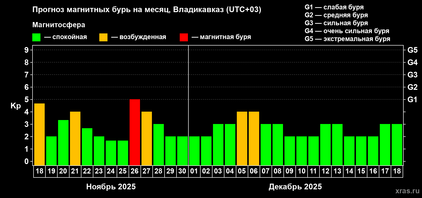 Прогноз магнитных бурь во Владикавказе — 18 ноября 2025 года