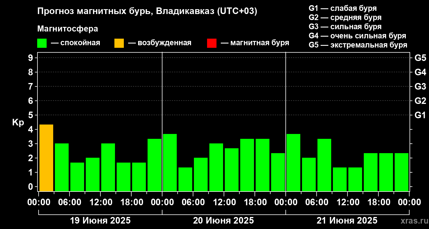 Прогноз магнитных бурь во Владикавказе на 19 июня 2025 года