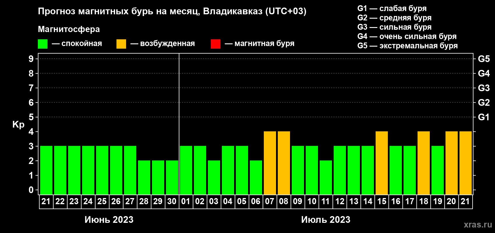 Прогноз магнитных бурь во Владикавказе — 21 июня 2023 года