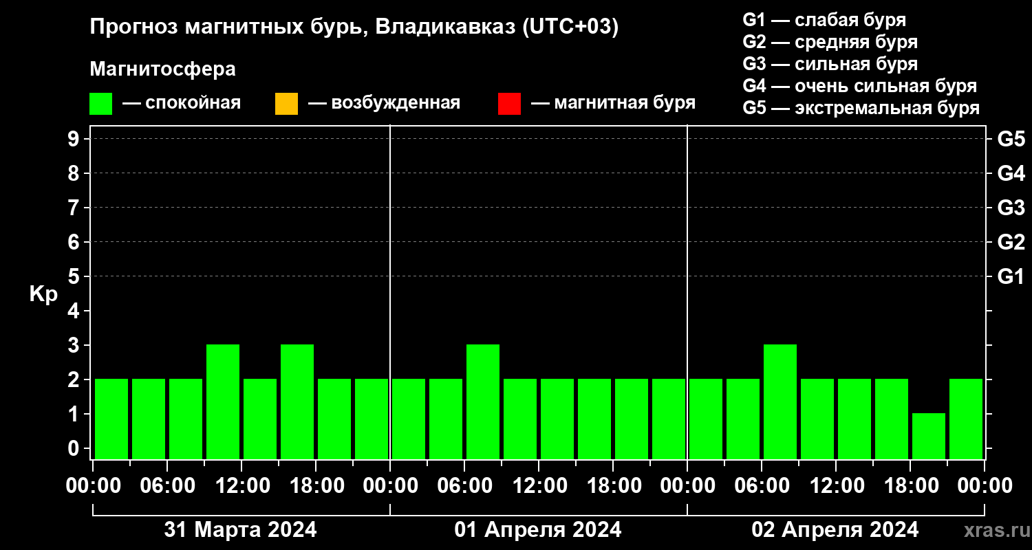 Прогноз магнитных бурь во Владикавказе — 31 марта 2024 года
