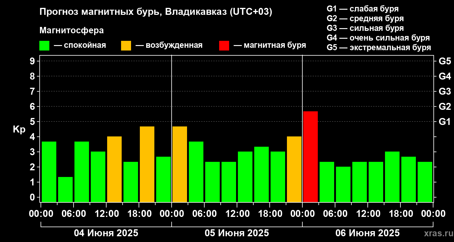 Прогноз магнитных бурь во Владикавказе — 4 июня 2025 года