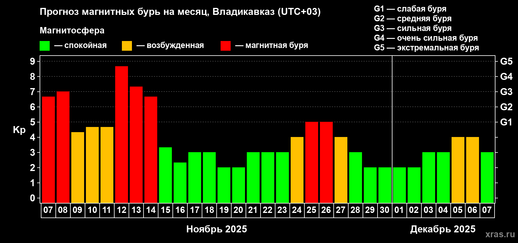 Прогноз магнитных бурь во Владикавказе — 7 ноября 2025 года