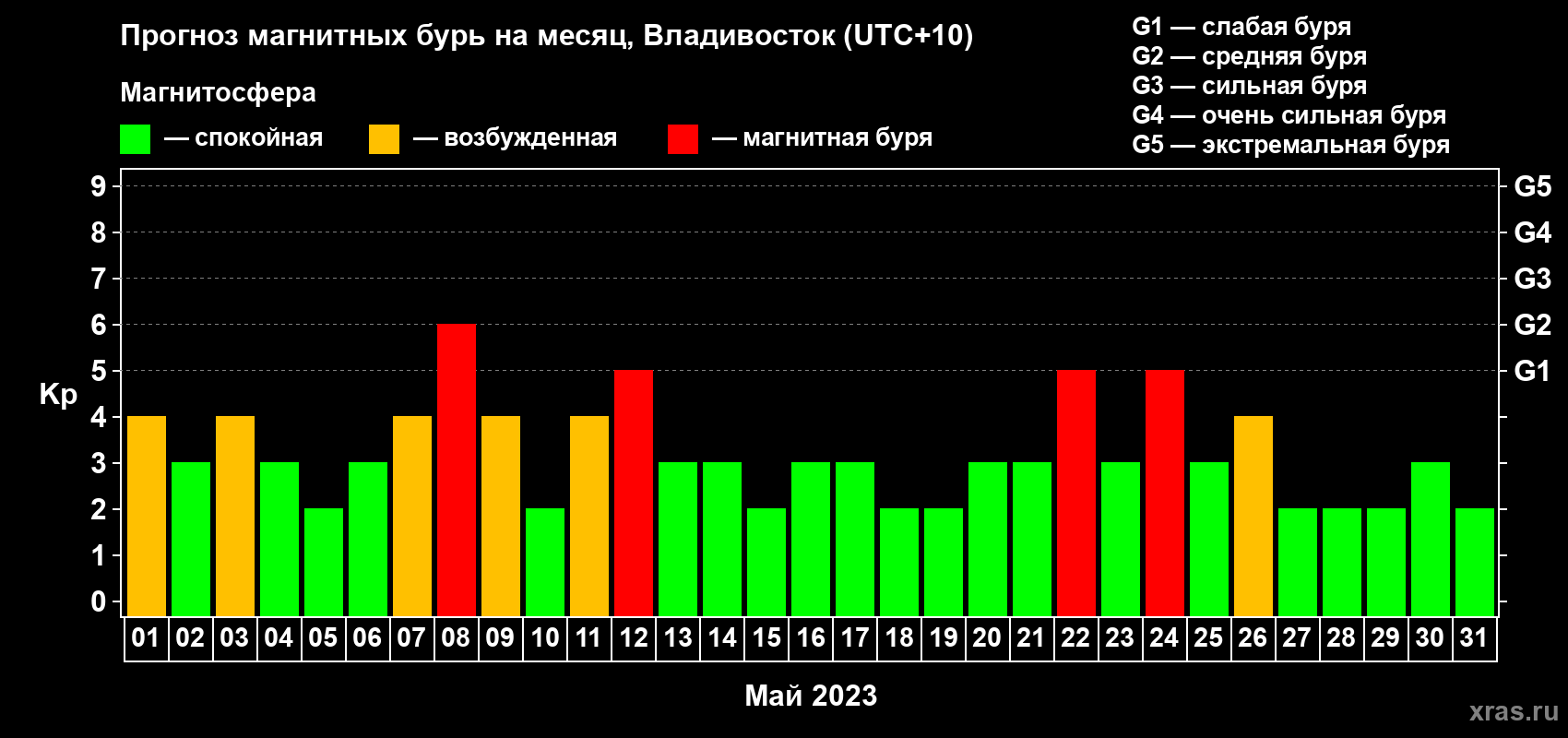 Прогноз магнитных бурь во Владивостоке на 1 мая 2023 года