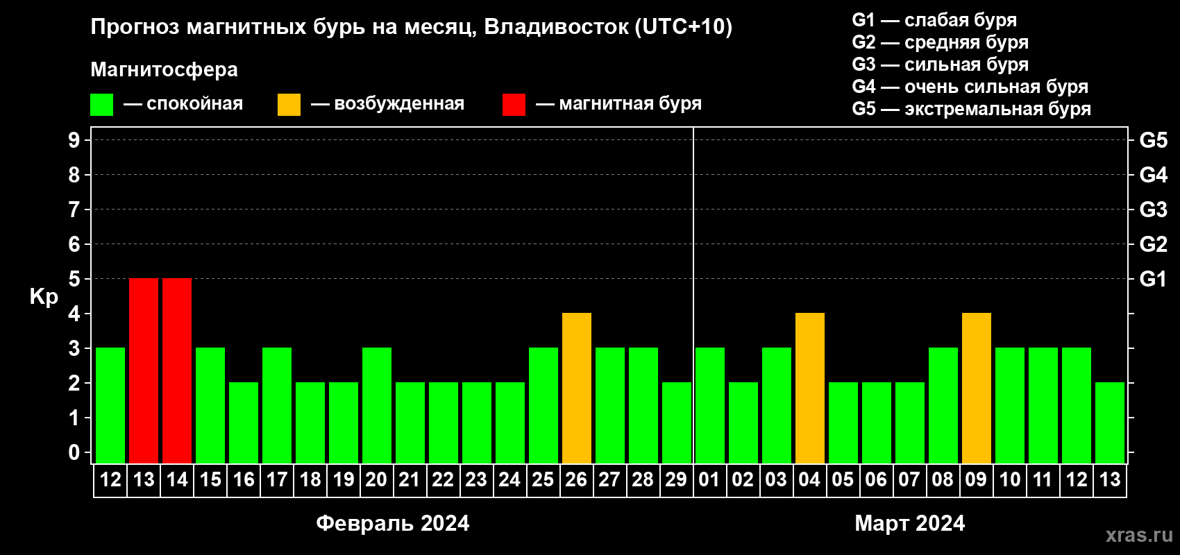 Прогноз магнитных бурь во Владивостоке — 12 февраля 2024 года