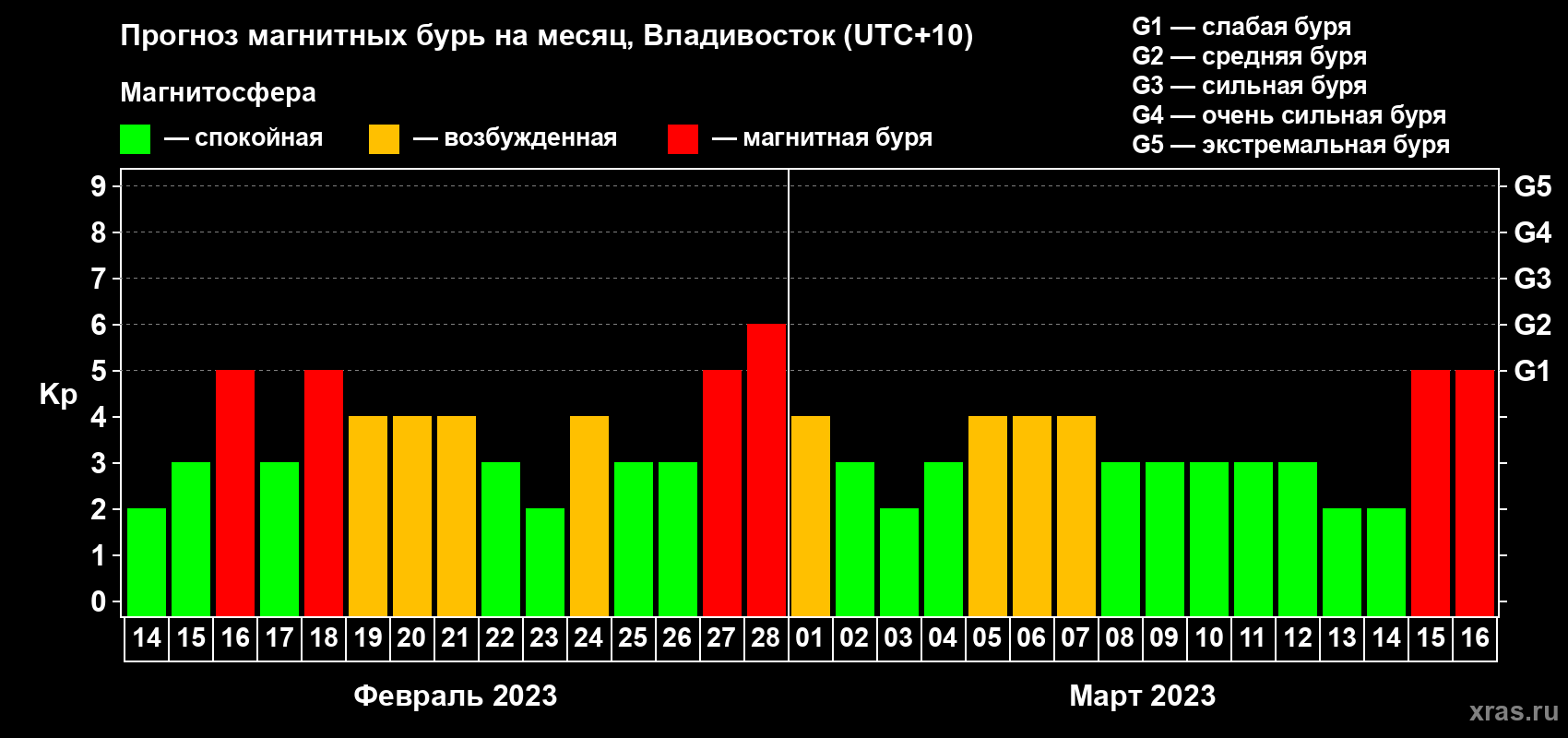 Прогноз магнитных бурь во Владивостоке — 14 февраля 2023 года