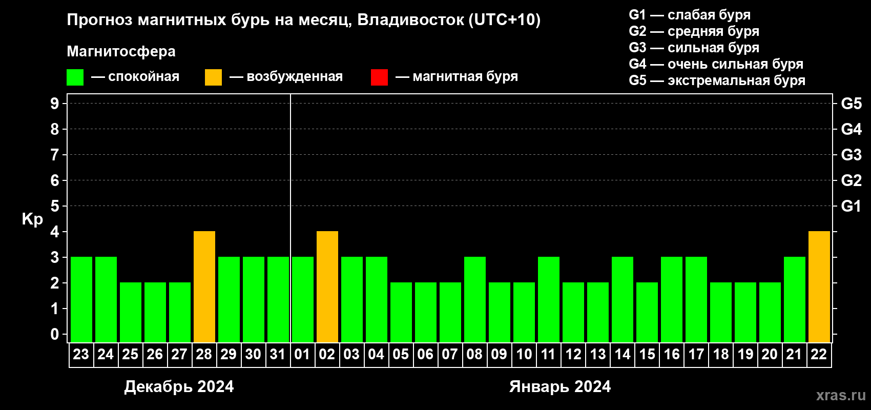 Прогноз магнитных бурь во Владивостоке — 23 декабря 2023 года
