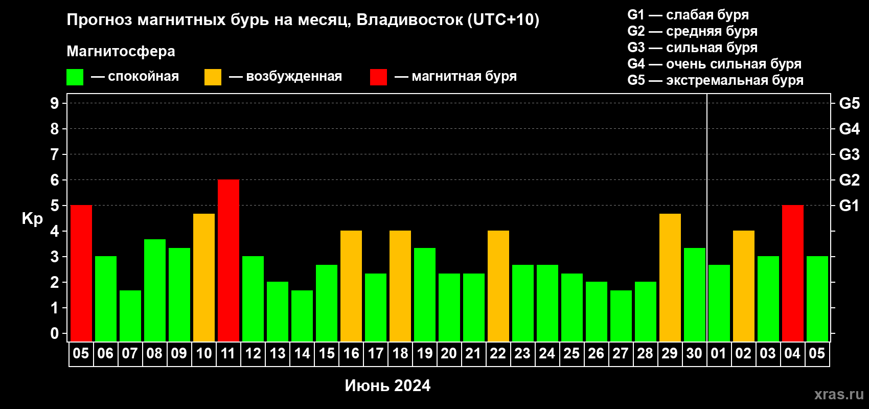 Прогноз магнитных бурь во Владивостоке — 5 июня 2024 года