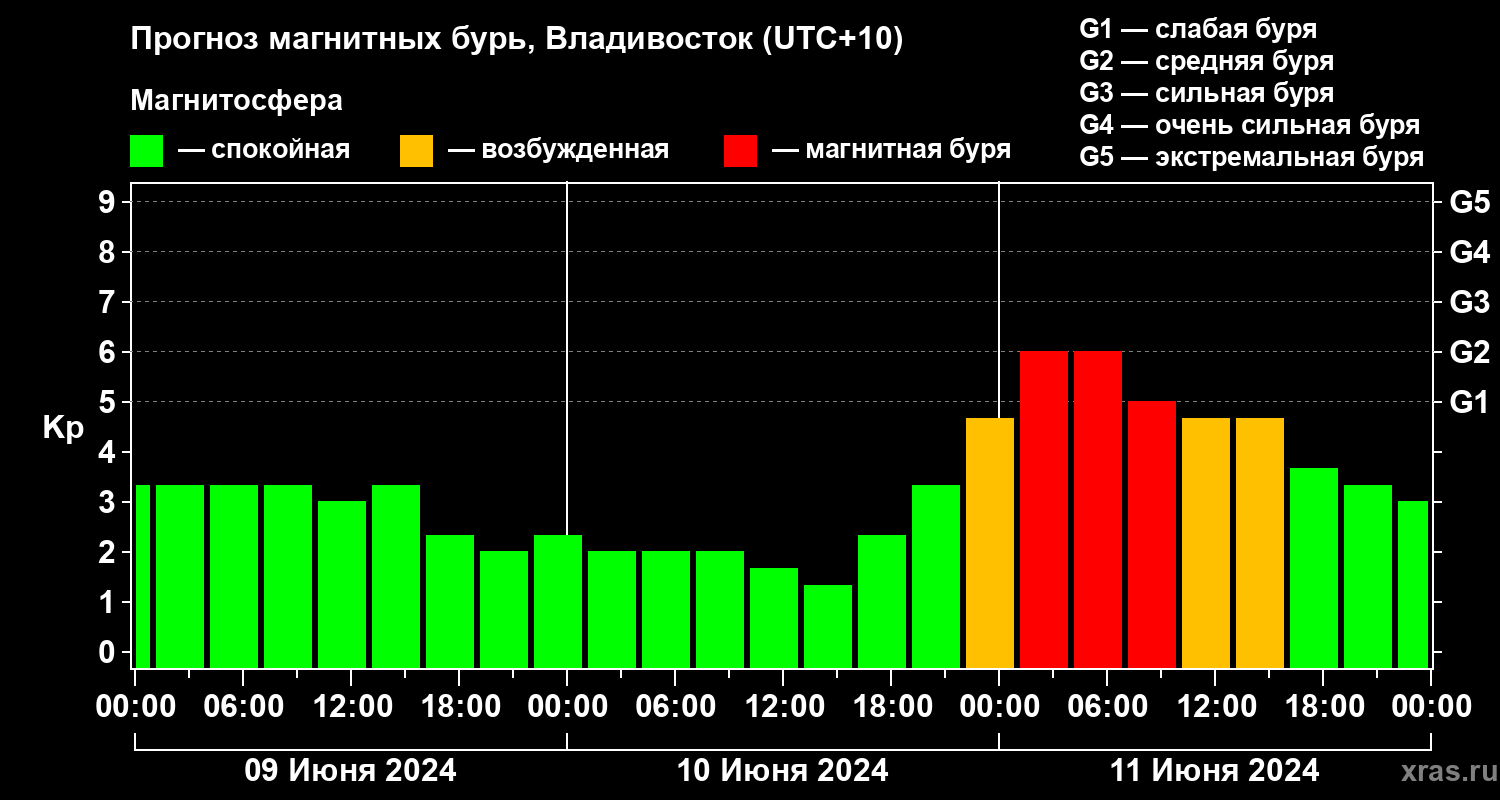 Прогноз магнитных бурь во Владивостоке — 9 июня 2024 года