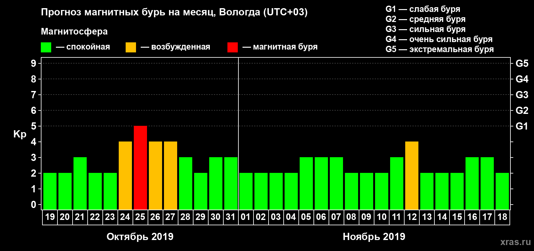 Прогноз магнитных бурь в Вологде на 19 октября 2019 года