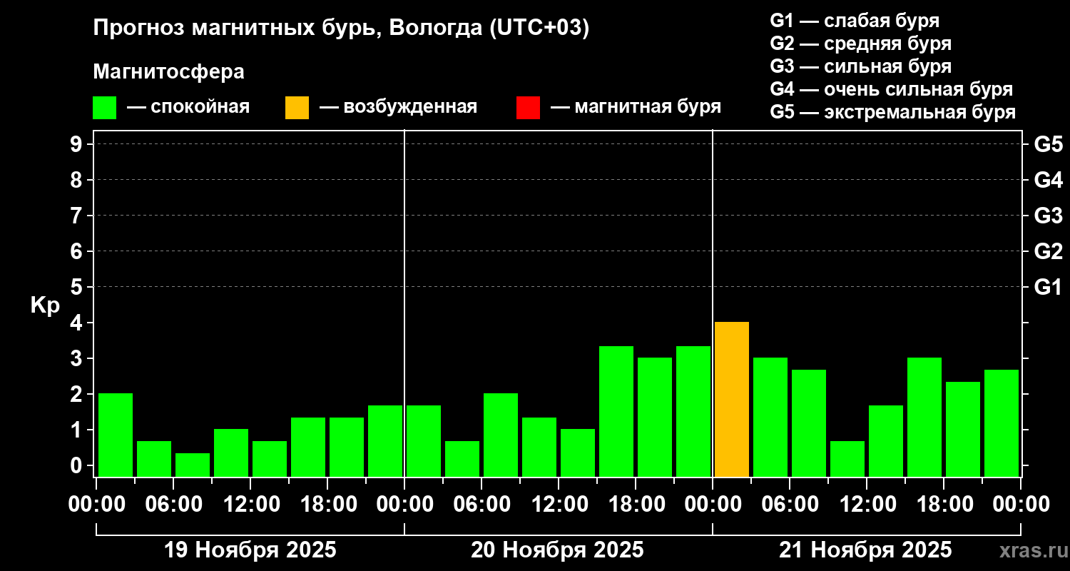 Прогноз магнитных бурь в Вологде — 19 ноября 2025 года