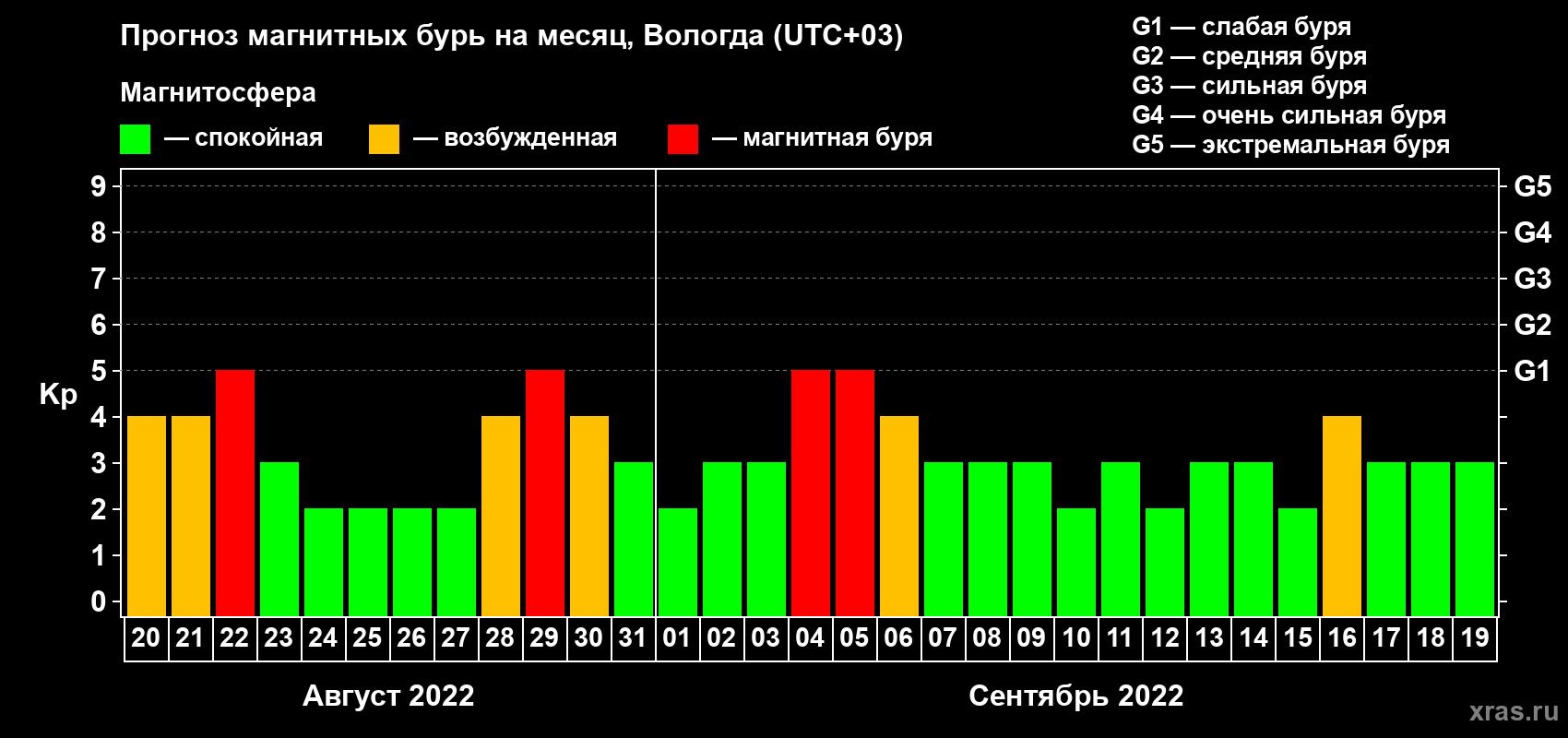 Прогноз магнитных бурь в Вологде на 20 августа 2022 года