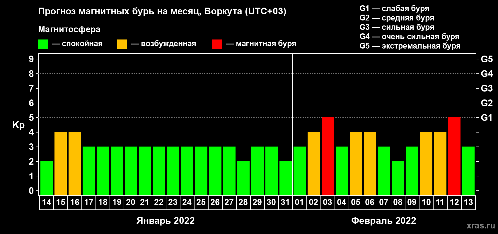 Прогноз магнитных бурь в Воркуте — 14 января 2022 года