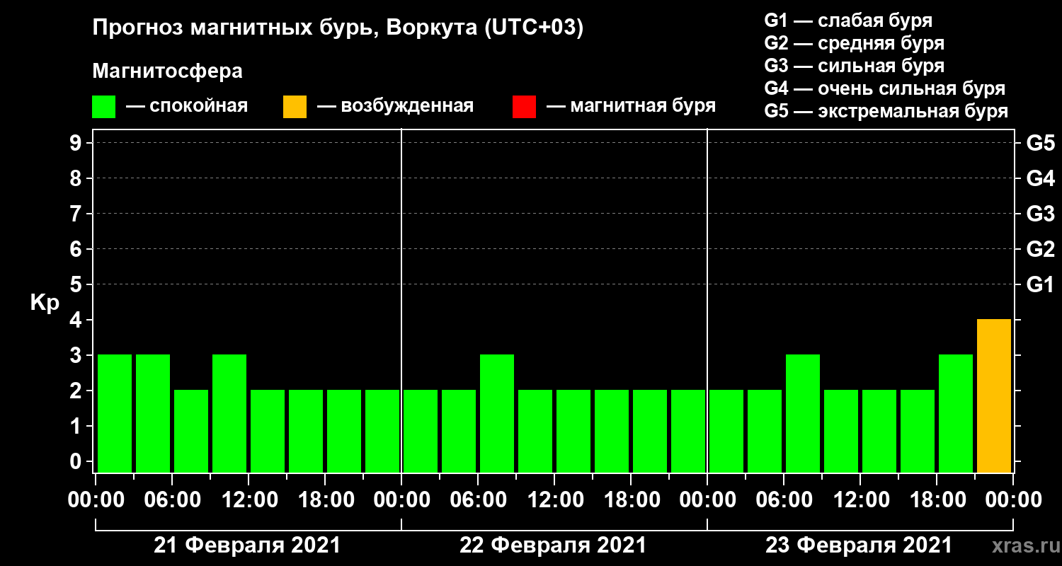 Прогноз магнитных бурь в Воркуте — 21 февраля 2021 года