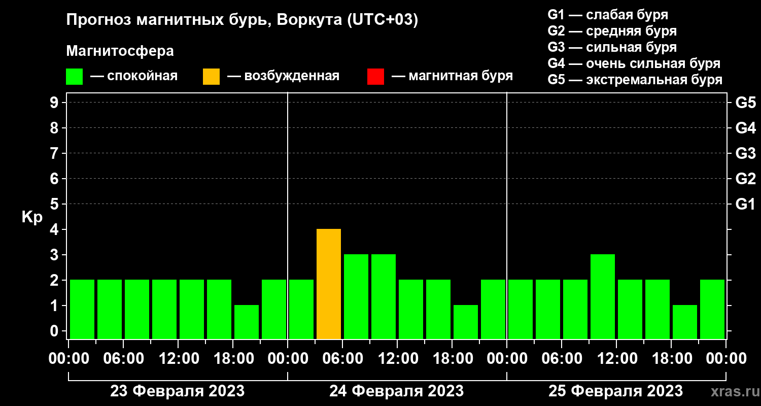 Прогноз магнитных бурь в Воркуте на 23 февраля 2023 года
