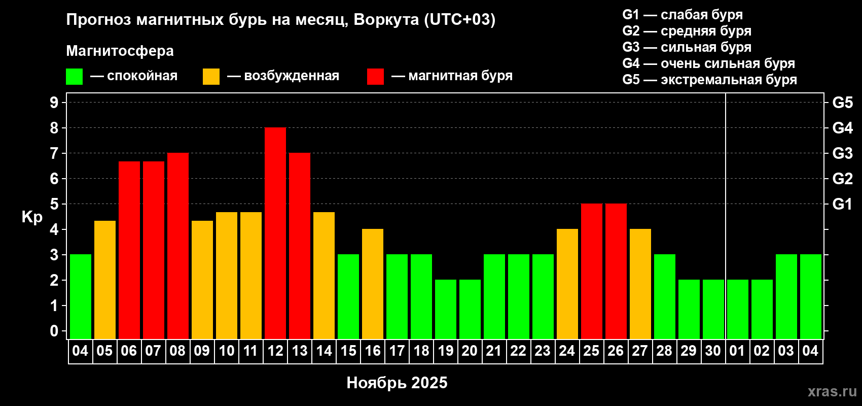 Прогноз магнитных бурь в Воркуте — 4 ноября 2025 года