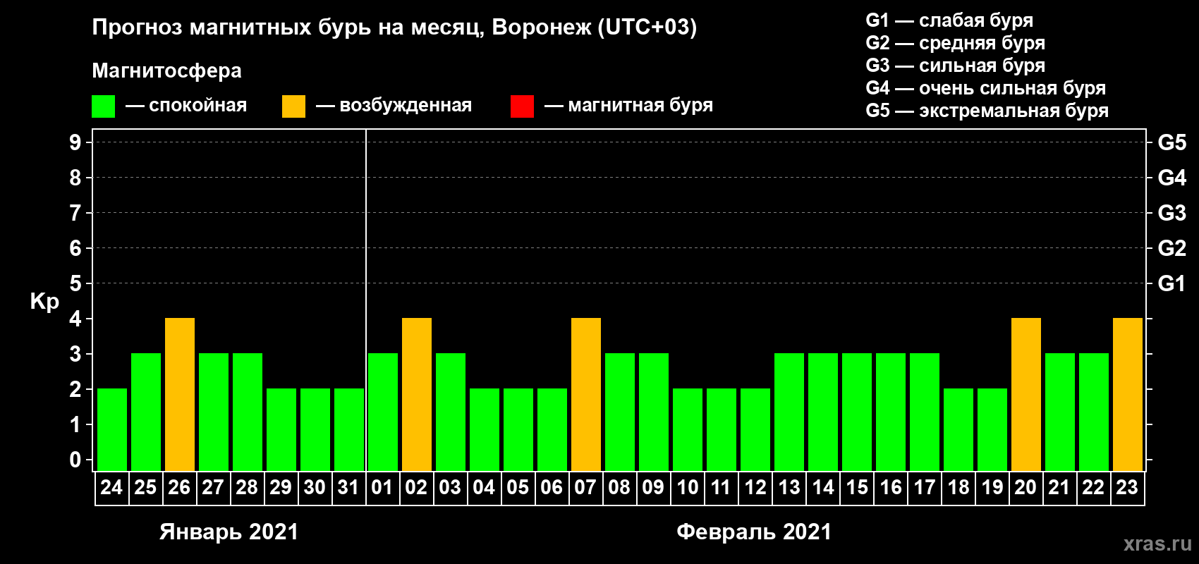 Прогноз магнитных бурь в Воронеже на 24 января 2021 года
