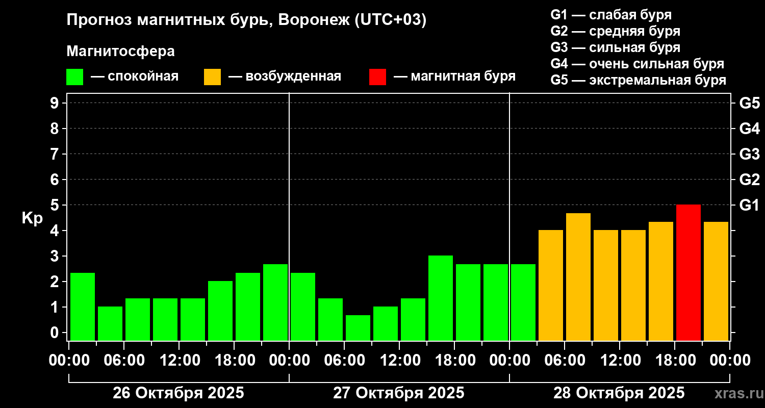 Прогноз магнитных бурь в Воронеже на 26 октября 2025 года