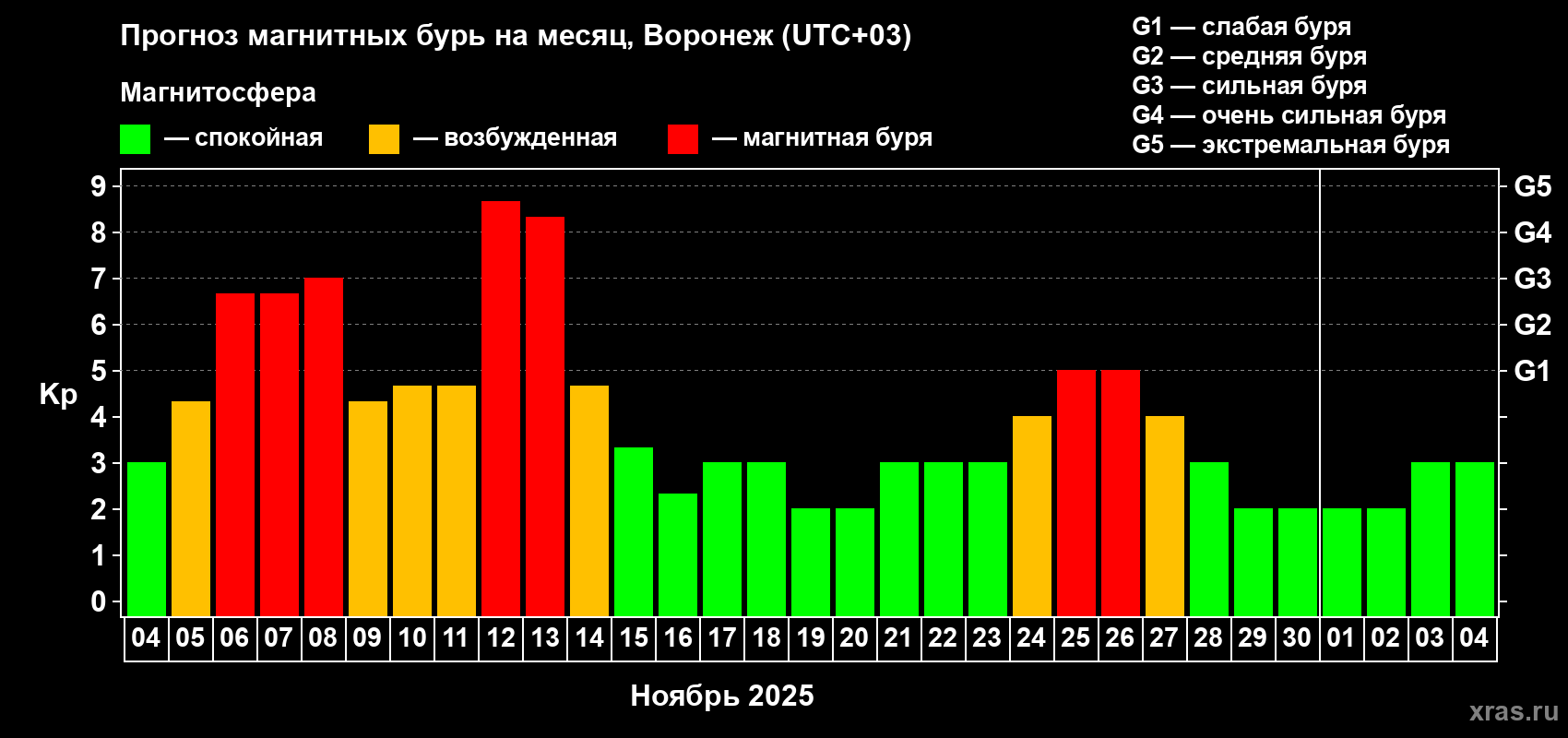 Прогноз магнитных бурь в Воронеже — 4 ноября 2025 года