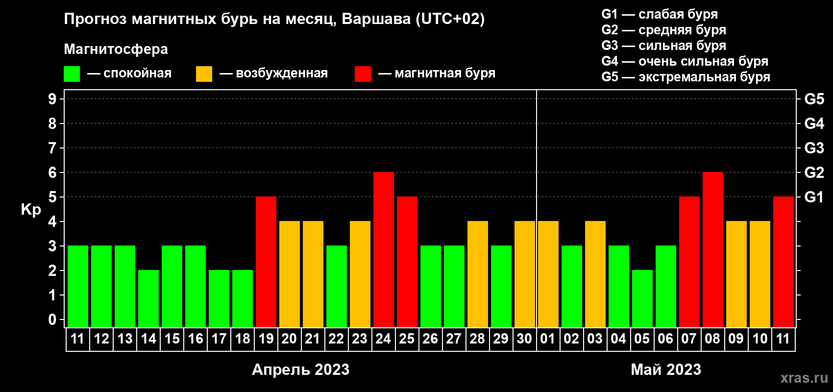 Прогноз магнитных бурь в Варшаве — 11 апреля 2023 года