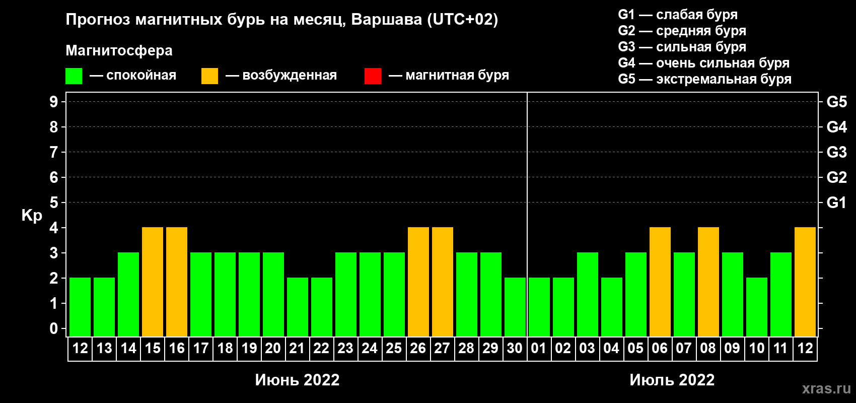 Прогноз магнитных бурь в Варшаве на 12 июня 2022 года