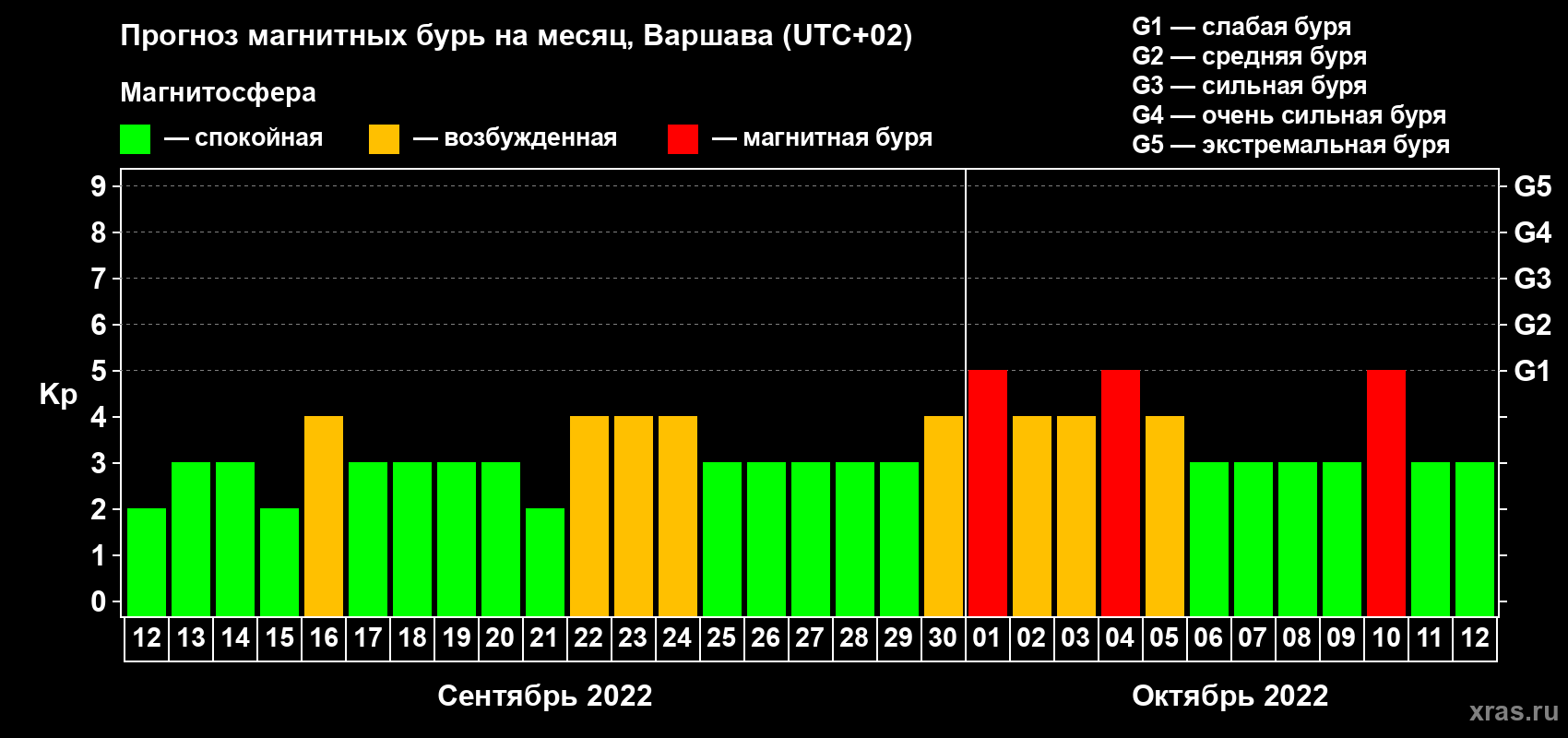 Прогноз магнитных бурь в Варшаве — 12 сентября 2022 года