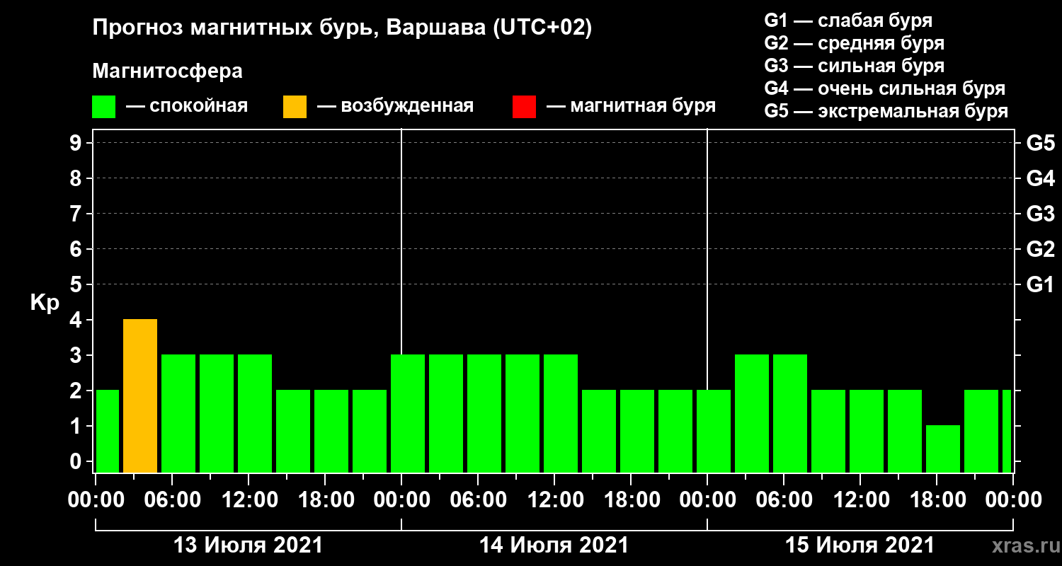 Прогноз магнитных бурь в Варшаве — 13 июля 2021 года