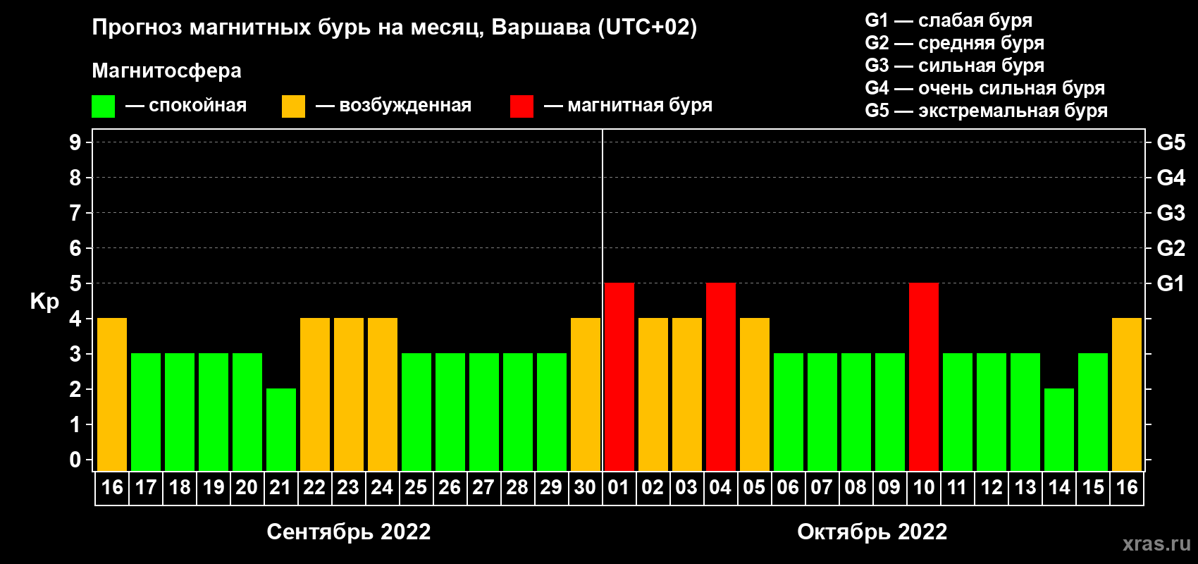 Прогноз магнитных бурь в Варшаве — 16 сентября 2022 года