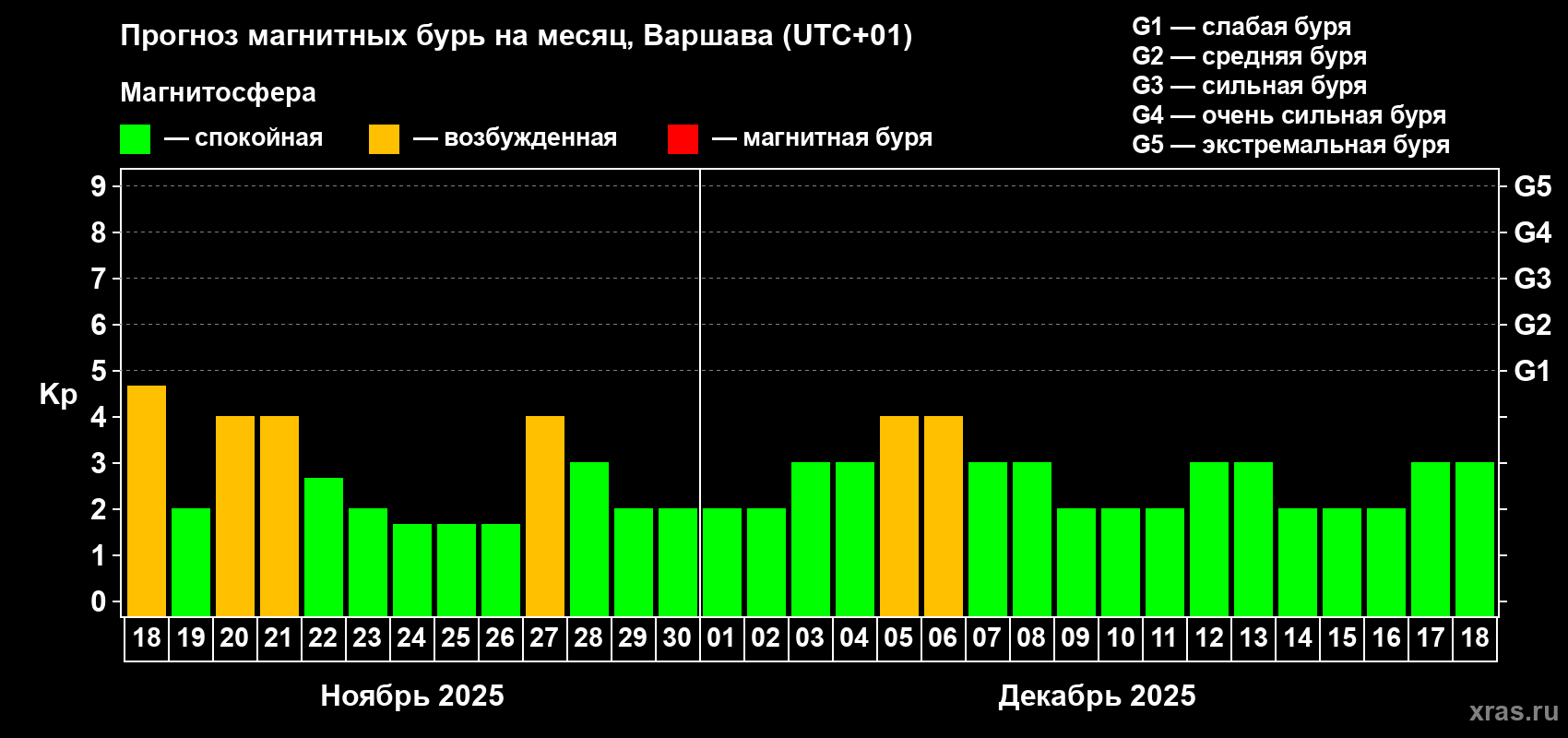 Прогноз магнитных бурь в Варшаве — 18 ноября 2025 года