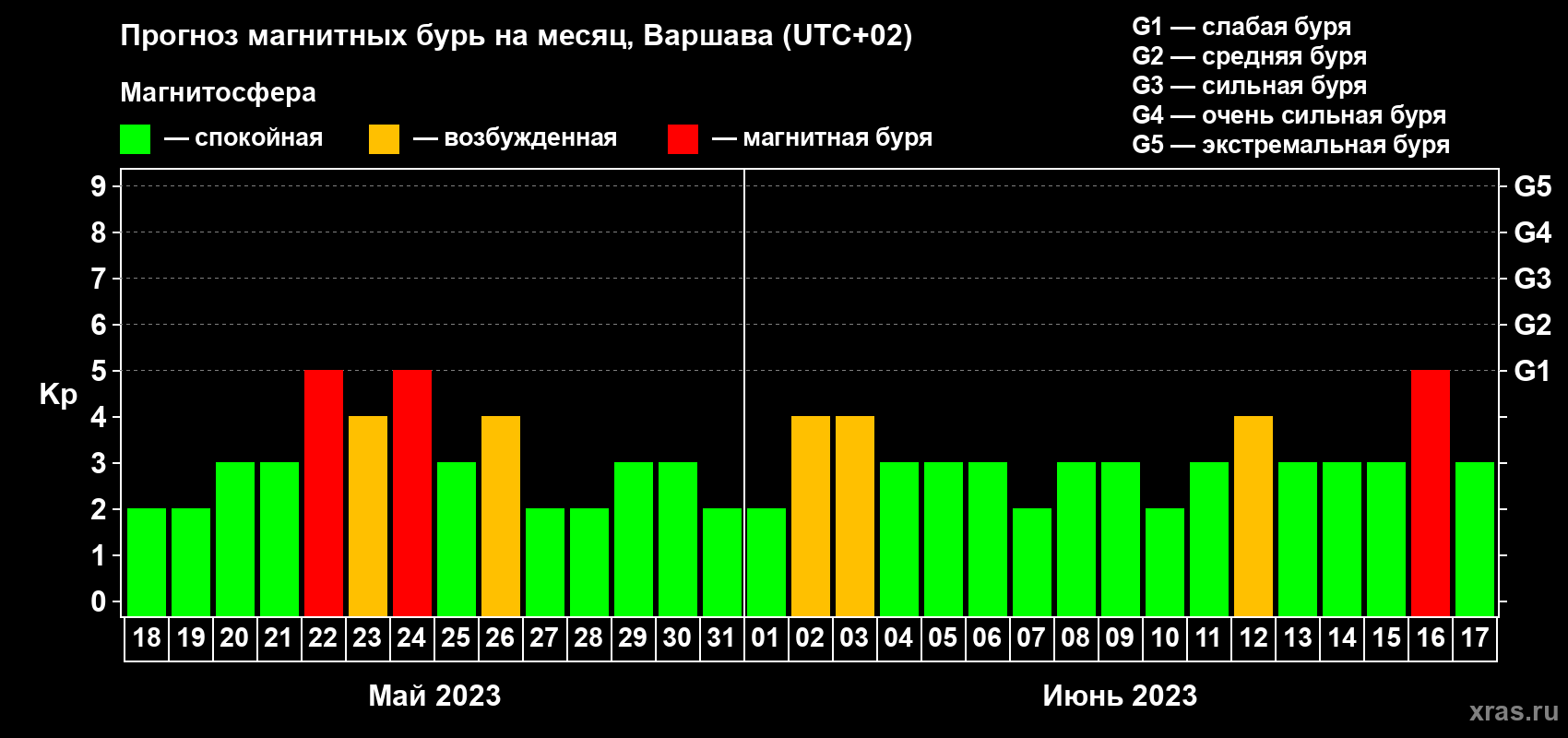 Прогноз магнитных бурь в Варшаве на 18 мая 2023 года