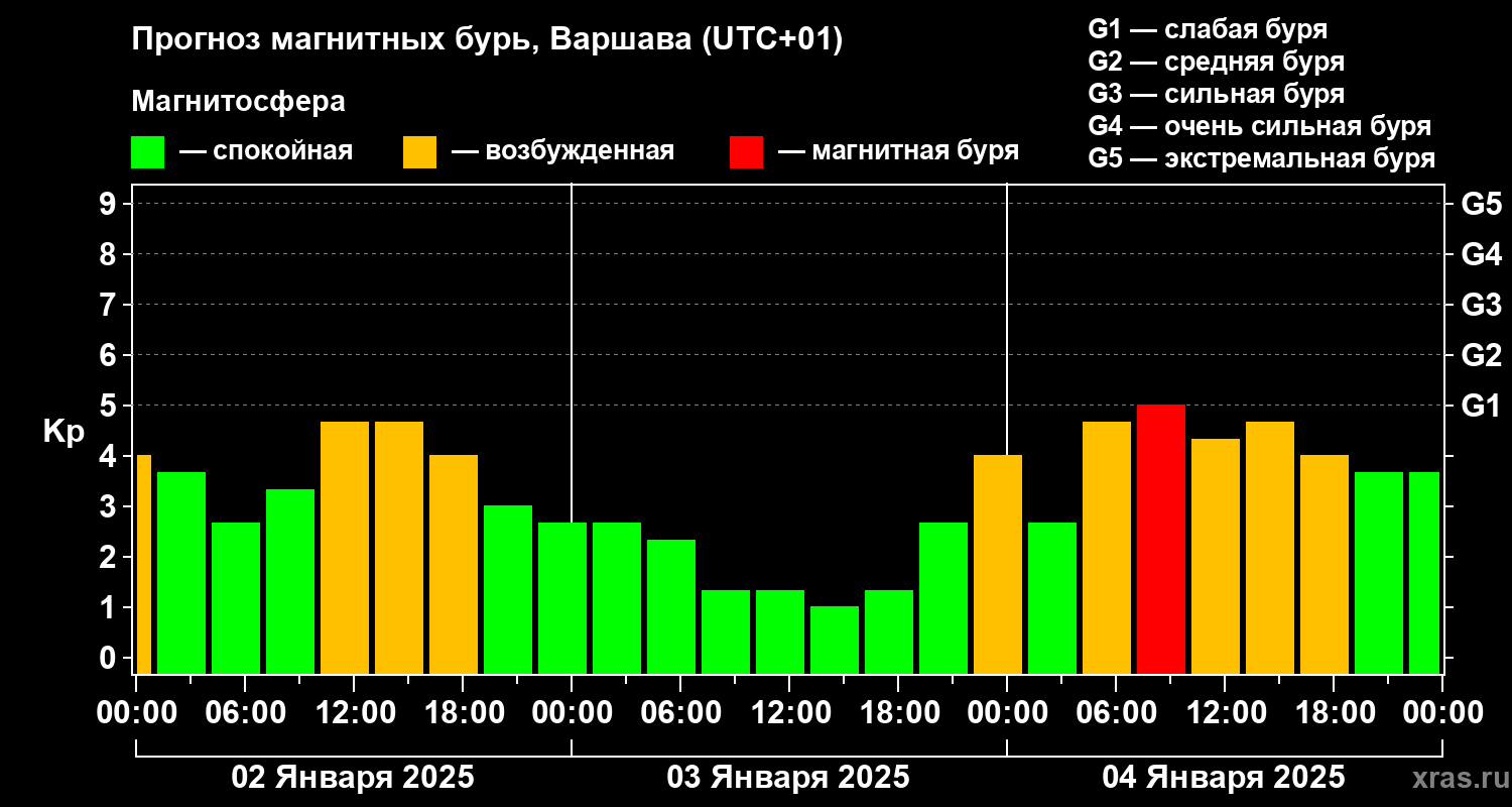 Прогноз магнитных бурь в Варшаве — 2 января 2025 года