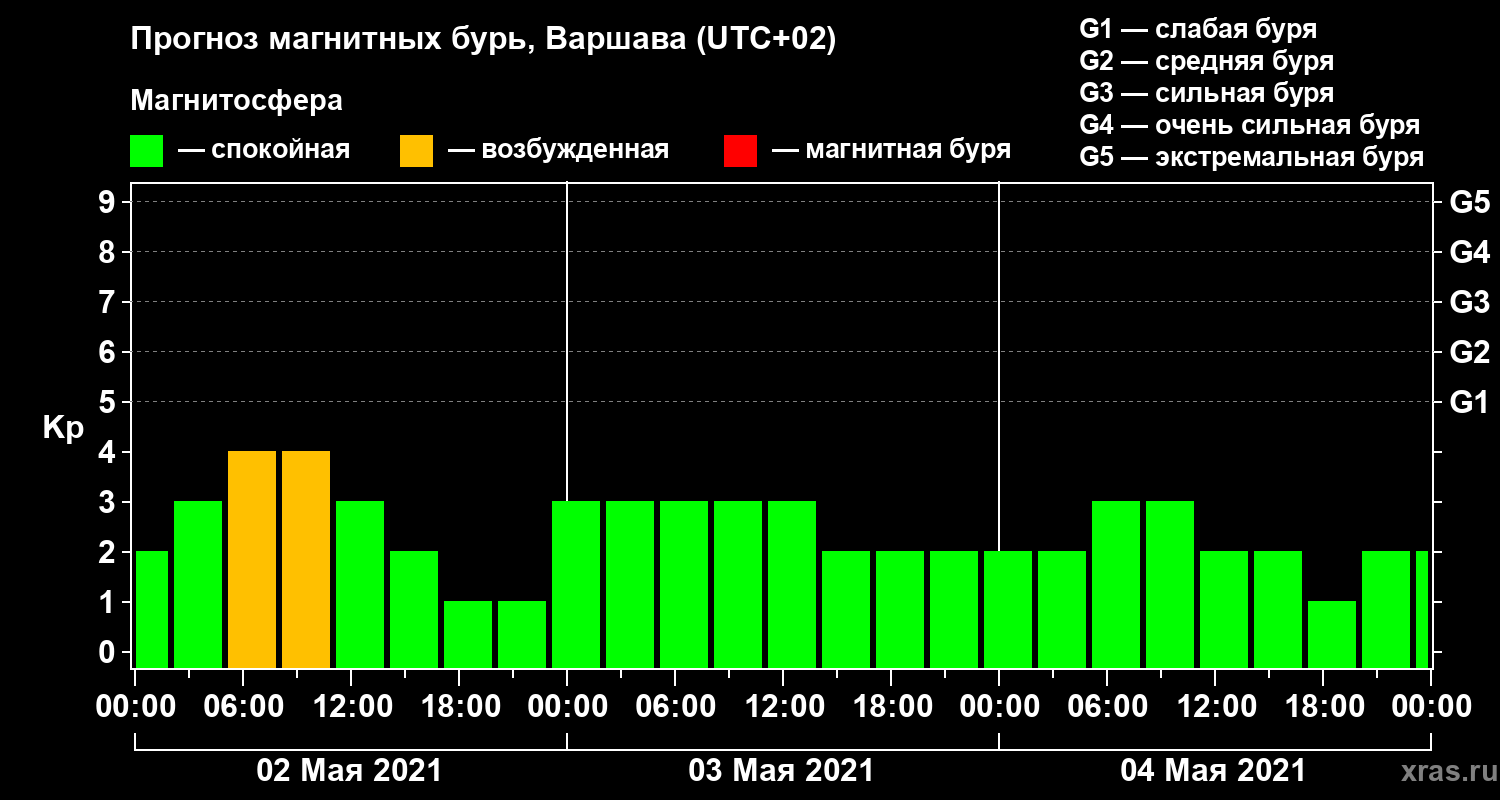 Прогноз магнитных бурь в Варшаве — 2 мая 2021 года