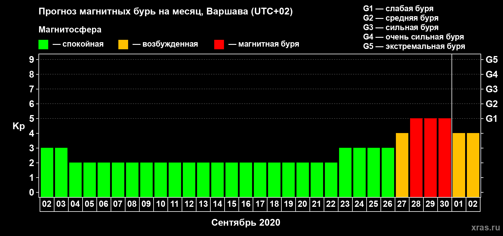 Прогноз магнитных бурь в Варшаве — 2 сентября 2020 года
