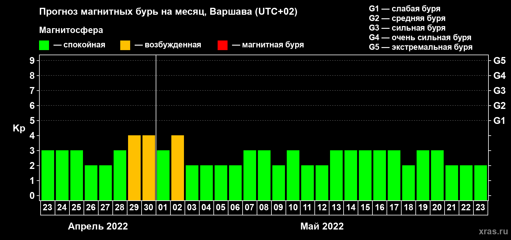 Прогноз магнитных бурь в Варшаве — 23 апреля 2022 года