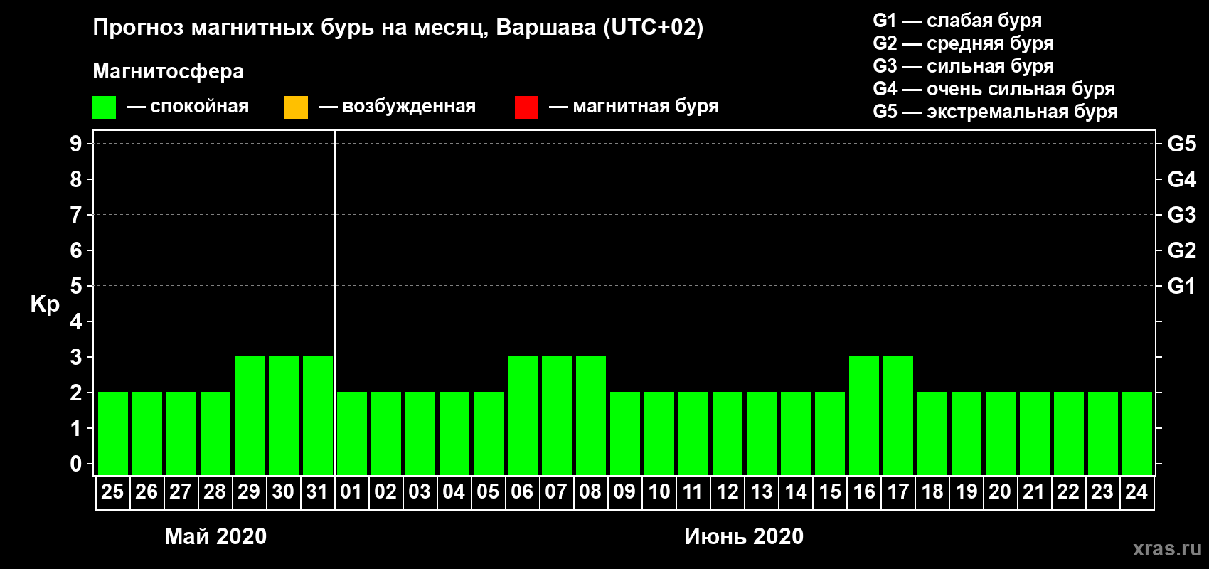 Прогноз магнитных бурь в Варшаве — 25 мая 2020 года