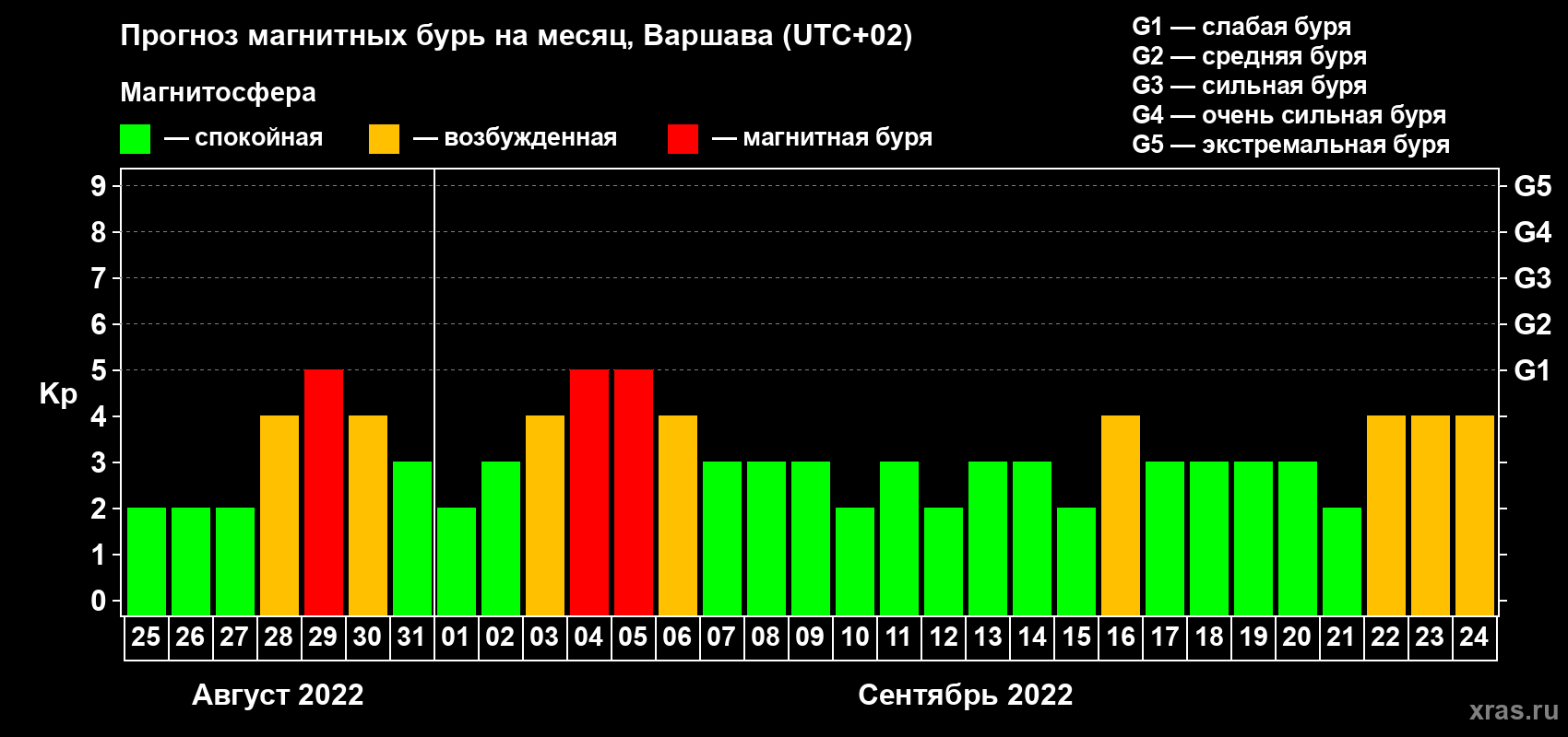 Прогноз магнитных бурь в Варшаве на 25 августа 2022 года
