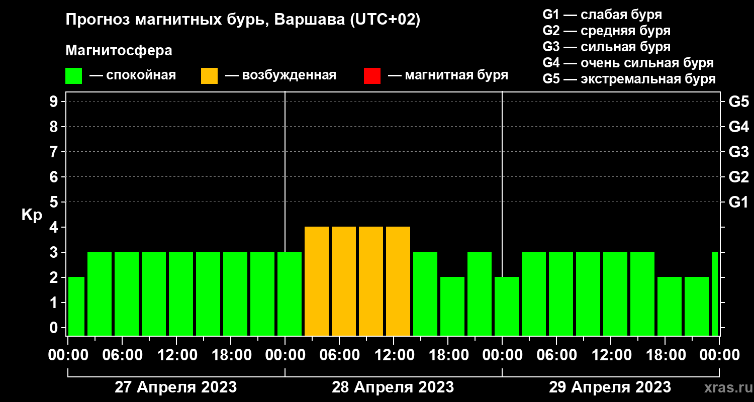 Прогноз магнитных бурь в Варшаве на 27 апреля 2023 года